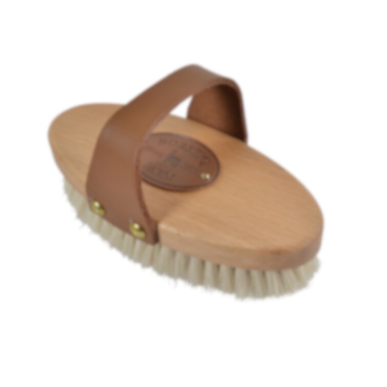 Ryktborste med rygg av bokträ och borst av 100% tagel. Designad med en greppvänlig läderrem.