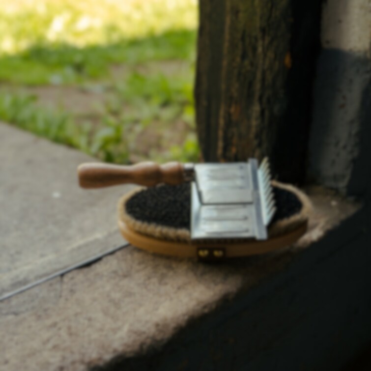 Traditionella ryktskrapa i metall med bokträskaft håller borstar fria från damm och smuts under rykt. Med ett extra rad större tänder för manvård, är denna skrapa även idealisk för tjocka pälsar och under fällningsperioder.