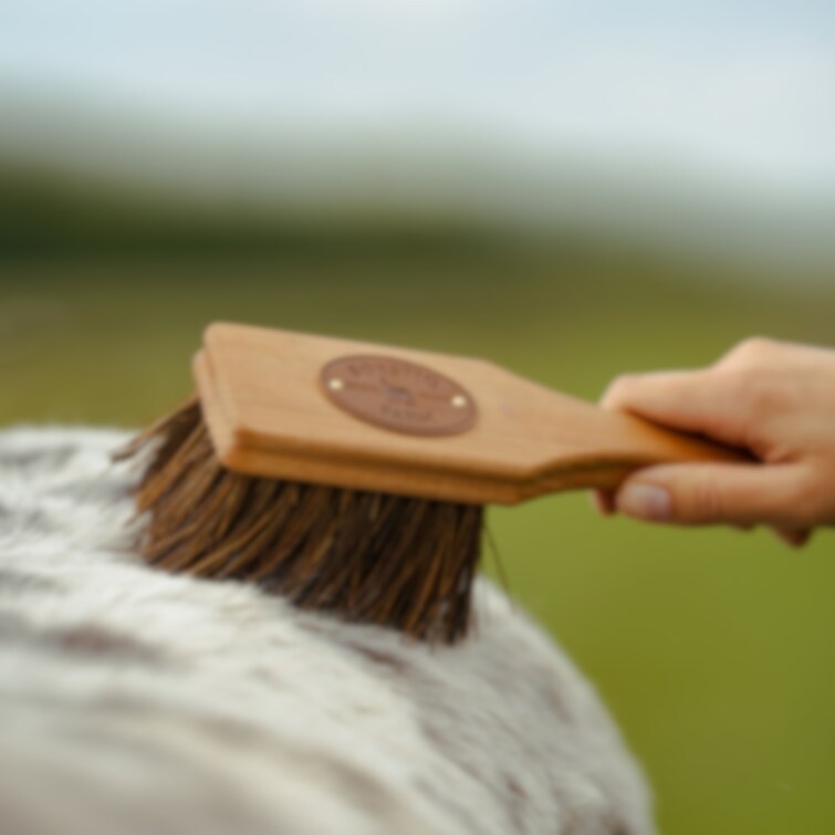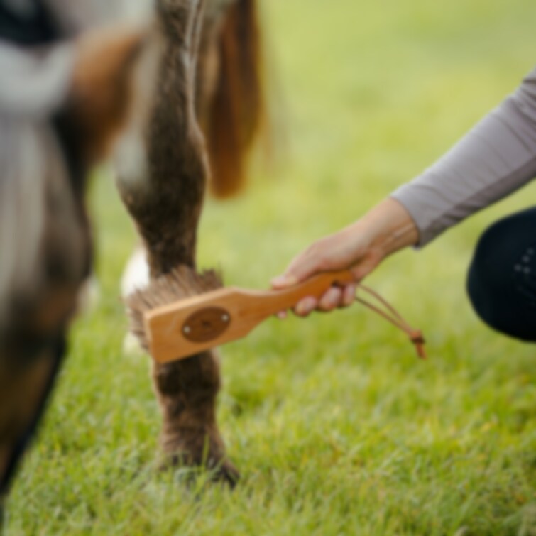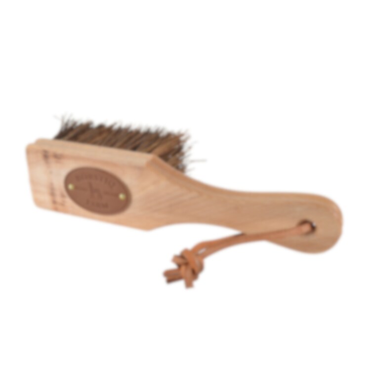 Robust naturborste av Bassine, en hållbar och grov växtfiber. Handtag i lövträ för rejält grepp samt en praktisk upphängningsrem i läder. Ergonomiskt utformad för att ligga bra i handen och ge effektiva borsttag. En hård rotborste som är idealisk för leriga ben och hästar med grövre päls, som islandshästar och kallblod. Fungerar även utmärkt som hovborste eller skrubba bort envis smuts från hinkar och andra stallredskap.