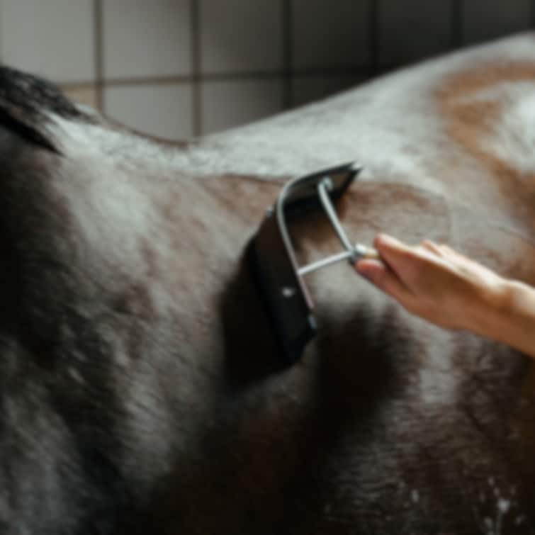 - Användning: Dra medhårs för att ta bort vatten eller svett från hela hästen kropp. Torka av svettskrapan efter användning och förvara den torrt.