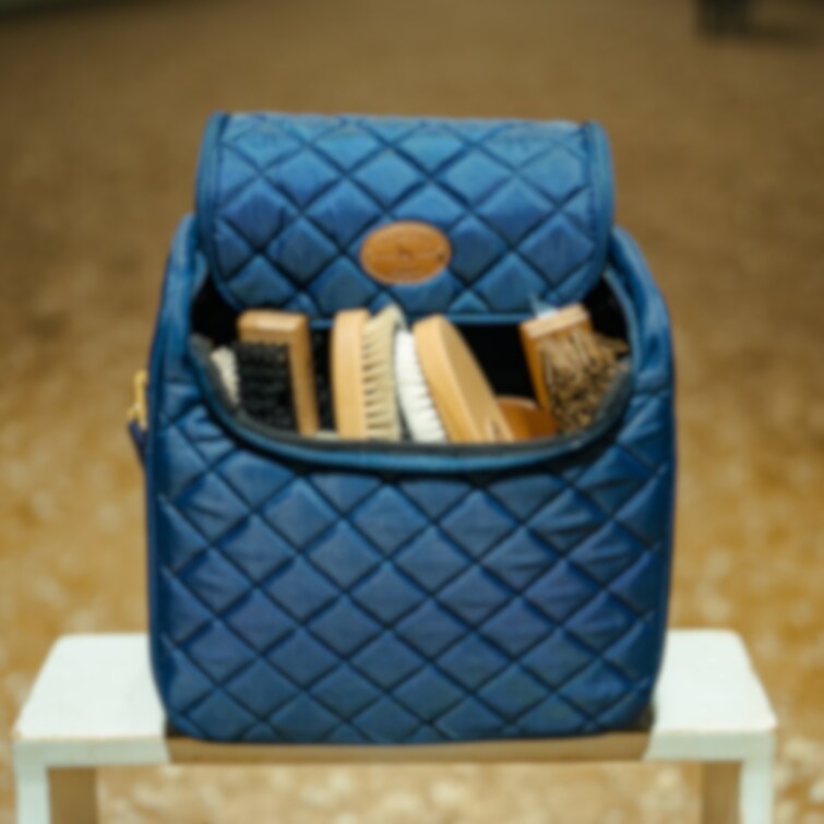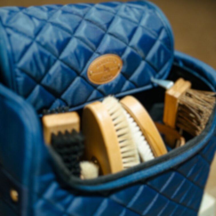 Elegant ryktväska från Borstiq Farm. Dekorativ quiltad framsida, mässingsfärgade beslag och klassisk läderlogo. Justerbara inlägg som kan flyttas med hjälp av kardborre, gör de möjligt att anpassa väskan efter unika behov. Funktionell ryktväska, som är skapat för att rymma borstar, pälsglans och allt annat som behövs vid rykttillfällena i stallet. Insida av slätt smutsavvisande foder. Designad med en kraftig dragkedja och en avtagbar rem med axelvaddering.