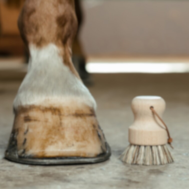 Rund hovborste med trärygg, designad med dekorativ läderrem för upphängning. Perfekta hjälpmedlet för att på bort ridhussand från hovarna eller vi rengöring av stigbyglar. Borst av Unionmix.